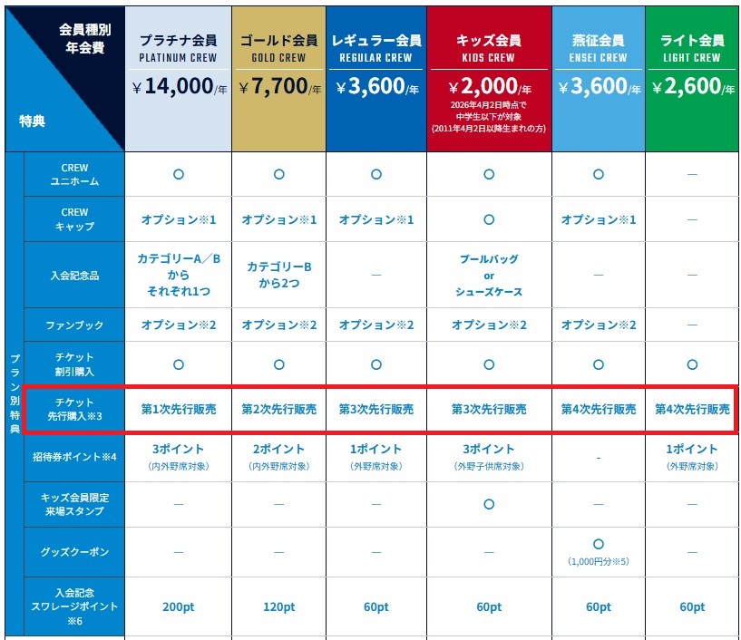 先程の関連記事でも触れた通り、ファンクラブまでは入会しなくとも、「スワチケ」という直営サイトに登録(無料)しておくと、1日のアドバンテージがあります。
